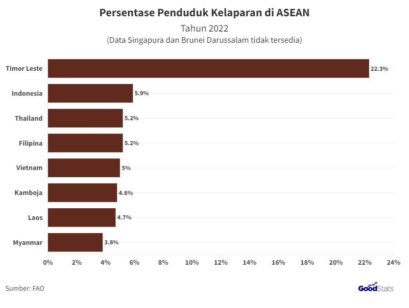 Dibandingkan negara-negara ASEAN lainnya, jumlah populasi kelaparan di Indonesia paling tinggi. Di Filipina, diperkirakan terdapat 5,9 juta jiwa kelaparan, 4,9 juta jiwa di Vietnam, 3,7 juta jiwa di Thailand, dan 2,1 juta jiwa di Malaysia. Di Indonesia sendiri, angkanya melonjak tinggi hingga mencapai 16,2 juta jiwa. Angka kelaparan yang dihimpun FAO merupakan Kumpulan data dari tahun 2020-2022.